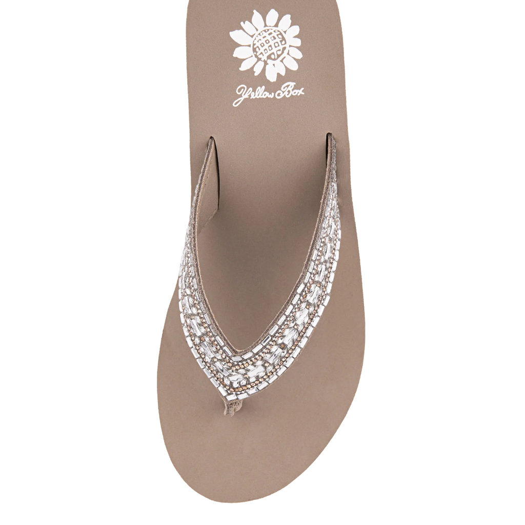 EMMIL is the ultimate versatile sandal, perfect for both dressing up or down. Its beautifully tiled straps add a touch of sparkle, effortlessly enhancing your work-to-play wardrobe. Plus, the lightweight Signature Yellow Box EVA footbed wedge ensures all-day comfort and easy wearability.