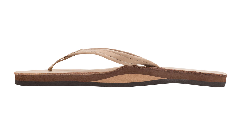 The single layer premier leather sandal is made of top grade nubuck leather; the top sole is embossed with the Rainbow® logo. This model comes with a 1/2" narrow strap, also nubuck leather; it is double stitched, and the nylon toe piece is secured with a box X stitch, all using bonded nylon thread.