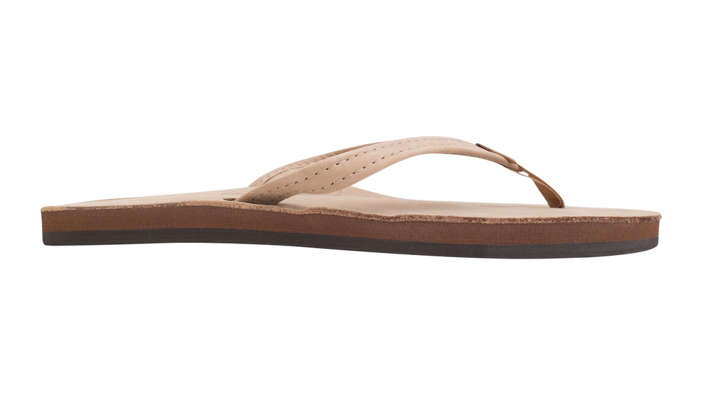 This feminine narrow strap flip has a single layer midsole with arch support, which sits on a non-slip Rainbow® bottom.