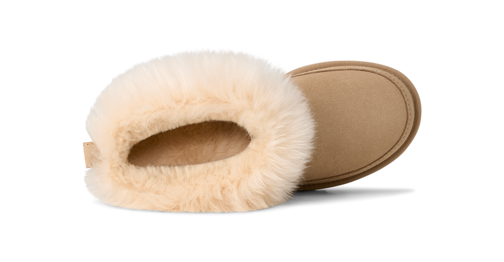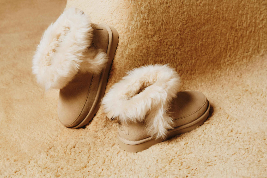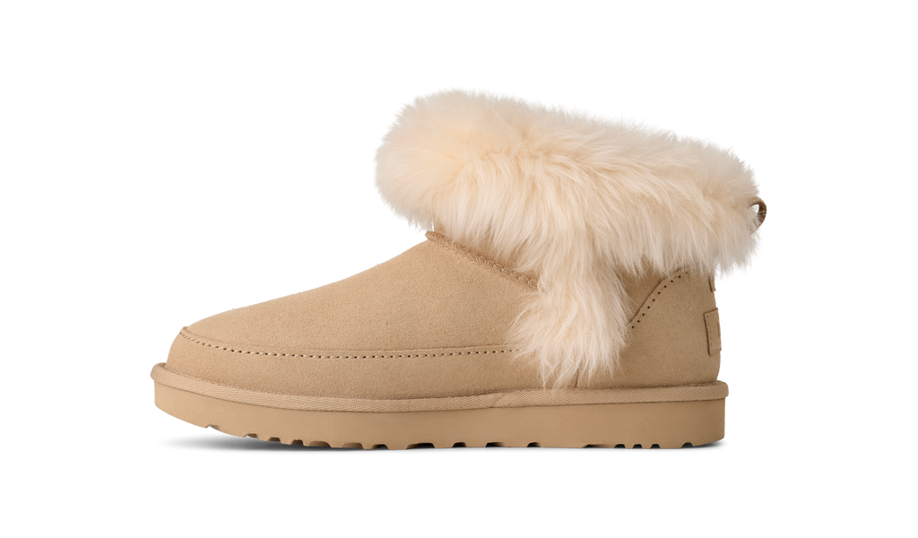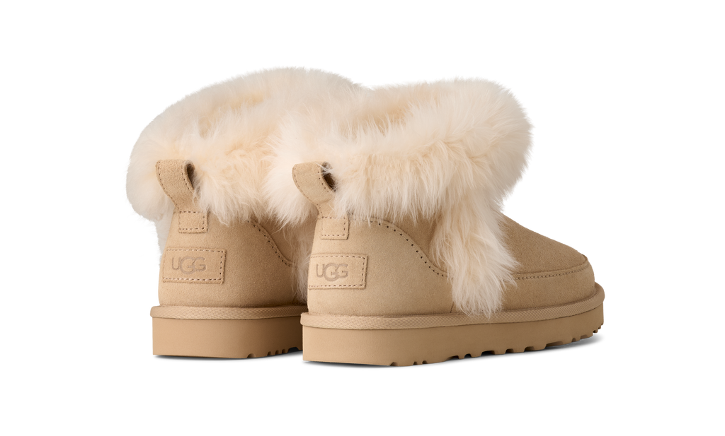 The Classic Ultra Mini you love—now even cozier. The Classic Ultra Mini Chalet keeps the easy low shaft but adds fluffy sheepskin trim for that snuggly, fireside feel. Made with rich suede and a lightweight sugarcane EVA outsole, it’s lined with our ultra-soft UGGplush™ from upcycled wool to keep you wrapped in warmth all season long.