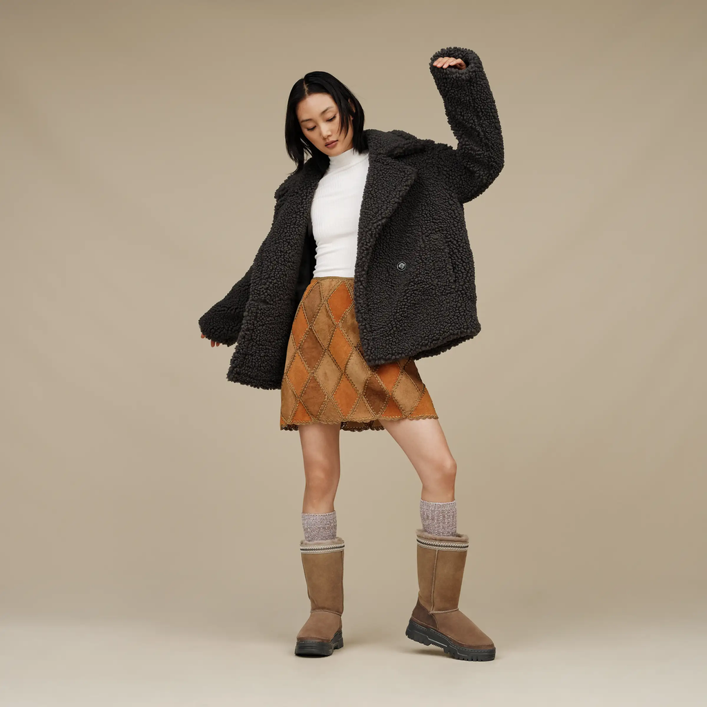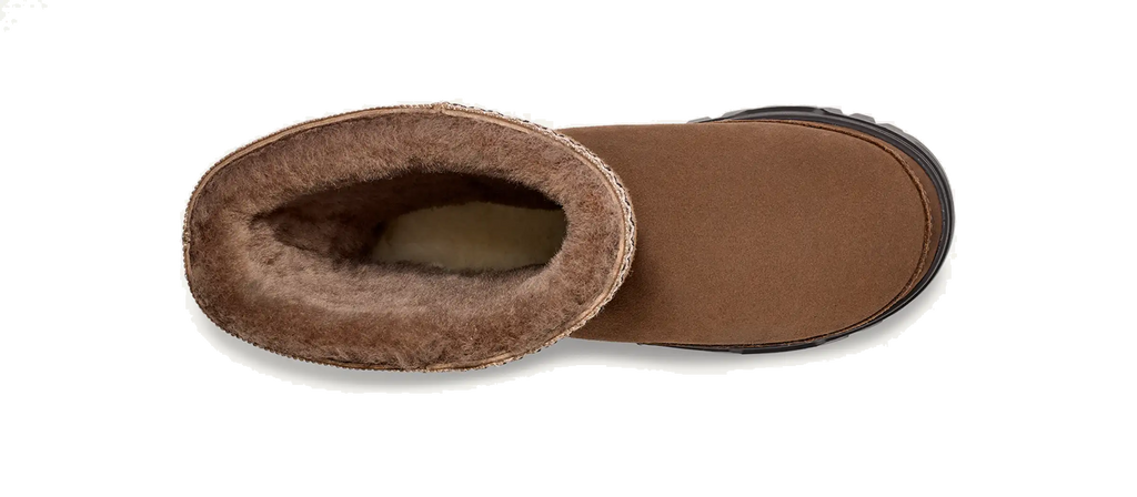 - Rear pull tab made from 100% recycled polyester fibers, UGGbraid detailing, Suede vamp, 17mm Twinface Sheepskin shaft, Leather mudguard, Leather heel counter