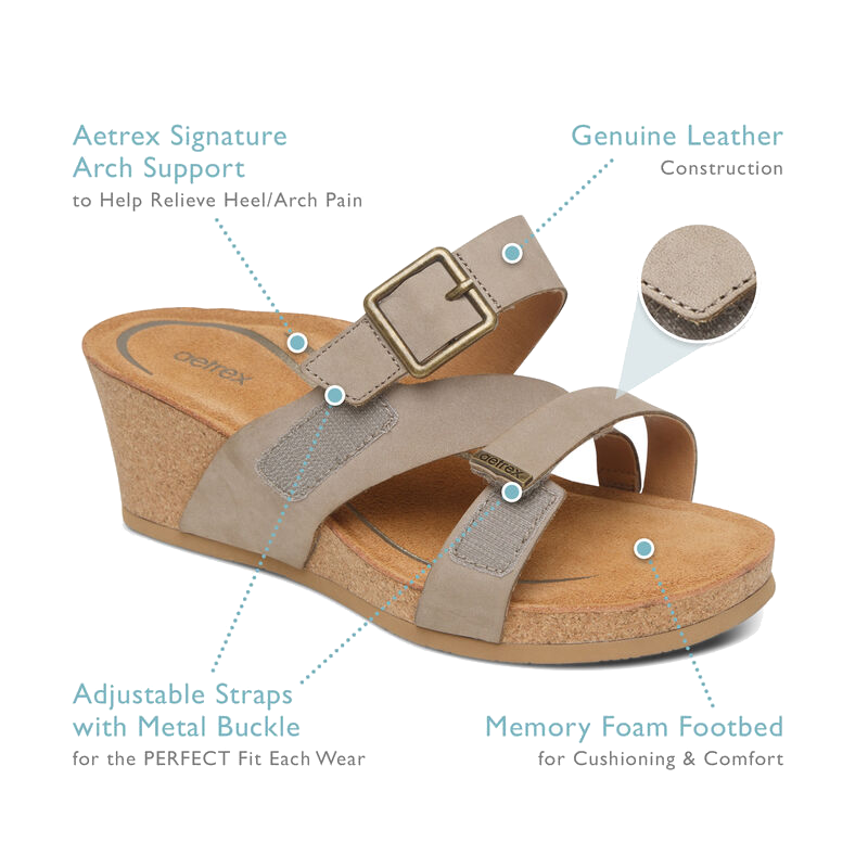 Aetrex's Kimmy. Something easy and fun to slip into. Fashion wedges meet comfort and support. Have you found your perfect wedge? These genuine leather wedges are contoured with an arch support and then layered with memory foam for a softer step. Walk comfortably in fashion, where you no longer have to compromise your feet and health. With such great support and comfort, you'll forget you're wearing wedges.