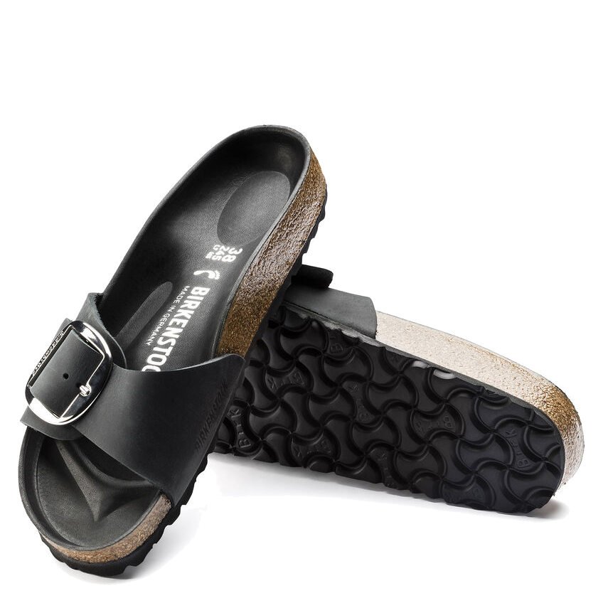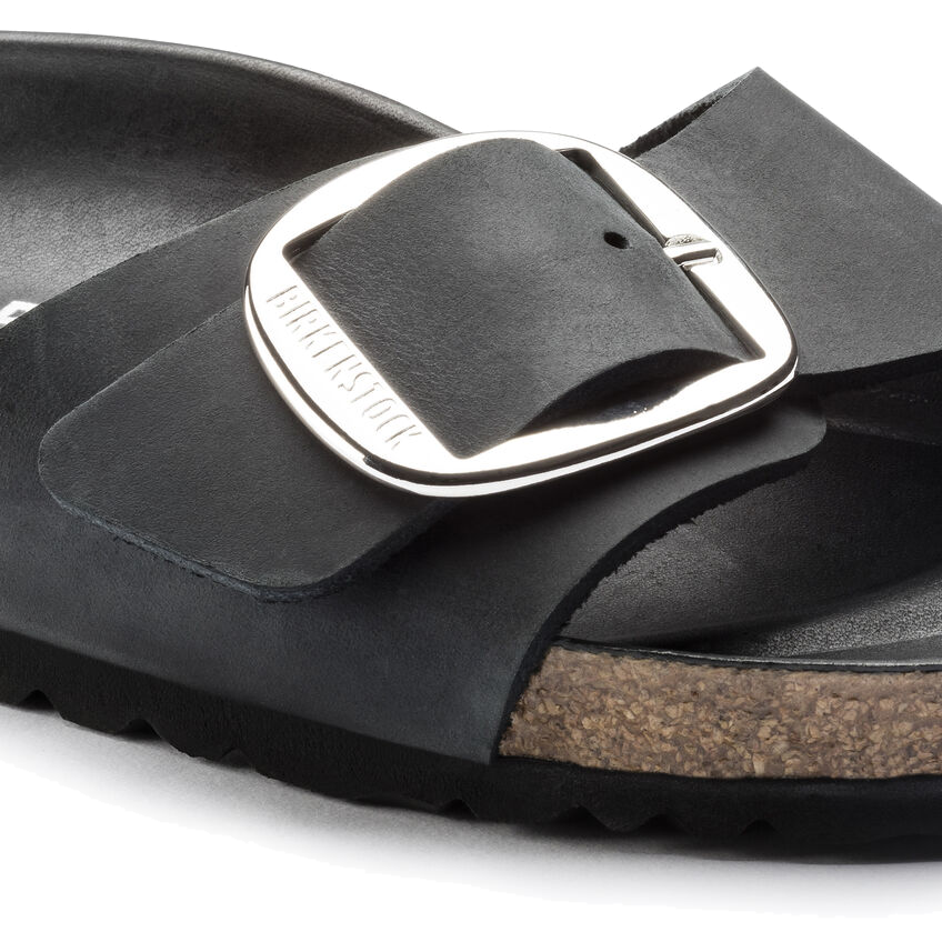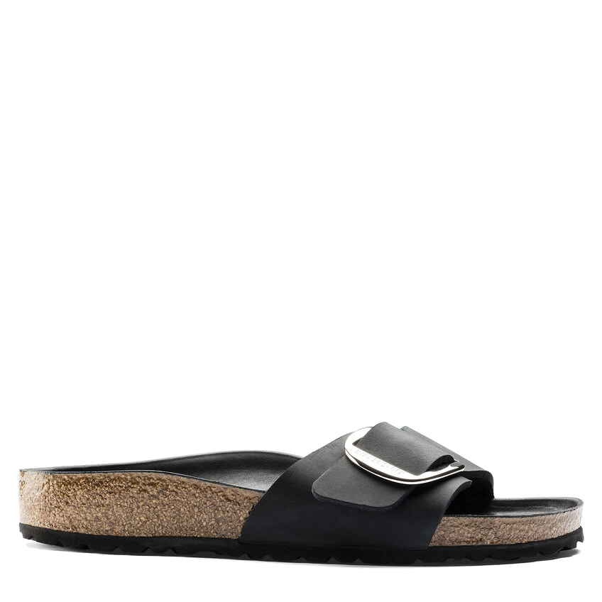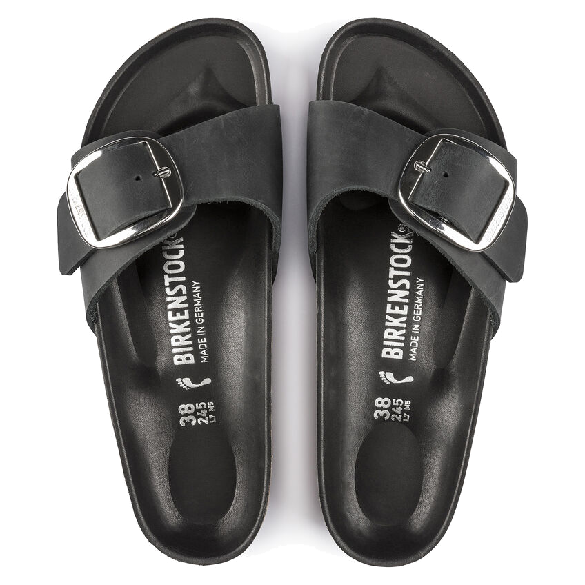This Birkenstock Madrid is embellished with an amplified buckle. Contoured with their signature Birkenstock footbed, this single strap sandal is a minimalist style offering Birkenstock's classic support.