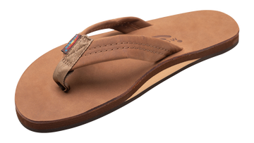 The single layer premier leather sandal is made with top grade nubuck leather; the top sole is embossed with the Rainbow® logo. The strap, also nubuck leather; is double stitched, and the nylon toe piece is secured with a box X stitch, all using bonded nylon thread.