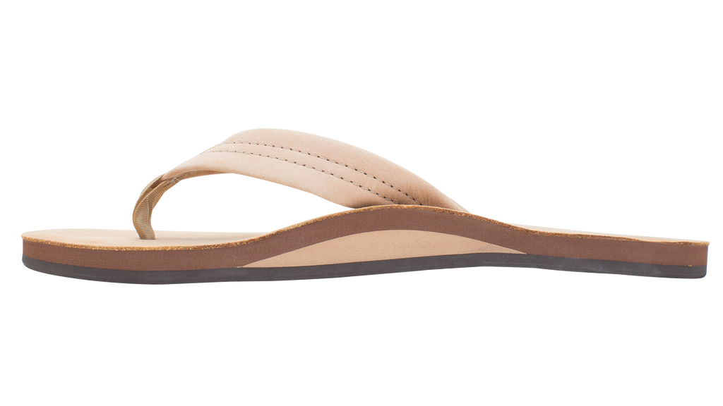 The single layer premier leather sandal is made with top grade nubuck leather; the top sole is embossed with the Rainbow® logo. The strap, also nubuck leather; is double stitched, and the nylon toe piece is secured with a box X stitch, all using bonded nylon thread.