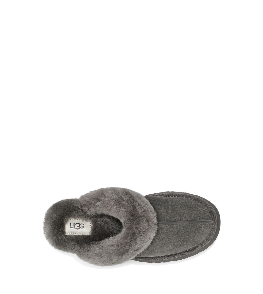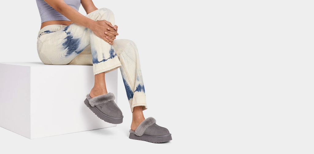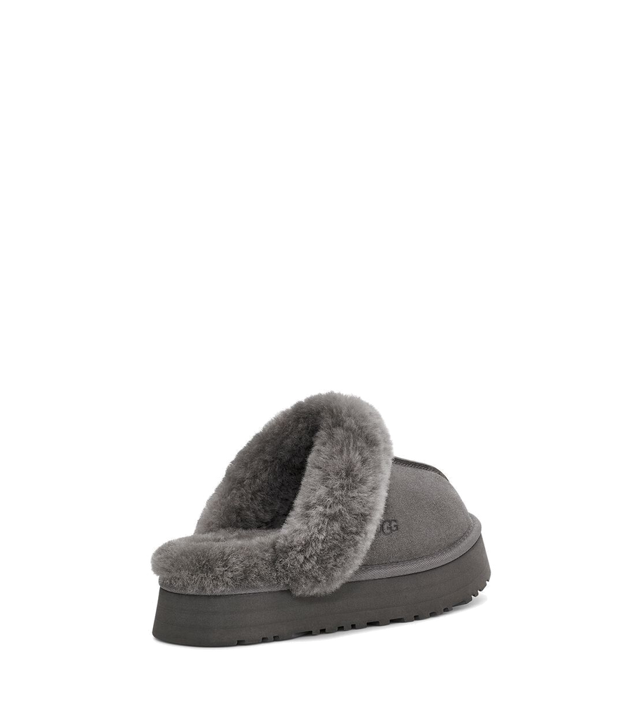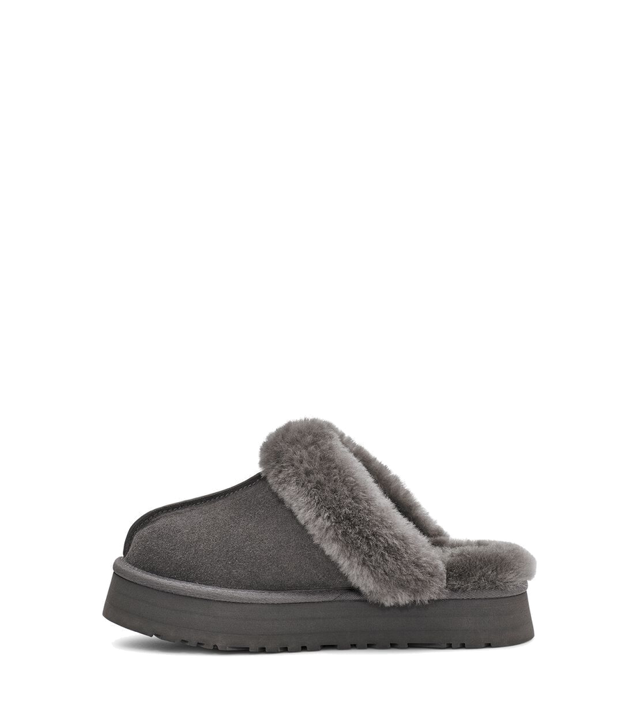 Combining designs of UGG's Coquette's and Disco silhouettes, this new clog brings new heights to one of their most popular slippers. Adding a 1" retro platform sole brings a new elevation of comfort for outdoor to all day comfort wear. These are more than just a slipper as these can be paired with jeans to a flowy midi dress. Crafted with suede uppers, this easy to slip on, Disquette features soft sheepskin with a lightweight sole.